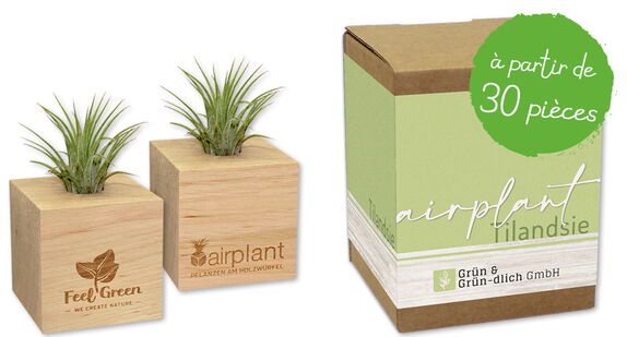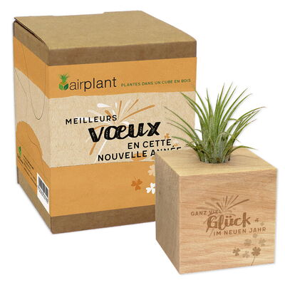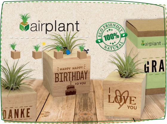 Les airplants sont une idée cadeau durable et à la fois facile à soigner. Dans un set airplant il y a une petite plante vivante avec un cube en bois de haute qualité pourvu d'une gravure au laser et sur lequel on place la plante. Les cubes en bois transforment les petites plantes vertes en un porteur de messages tendre et unique. La sorte Tillandsia ionantha que nous utilisons dépasse rarement une longueur de plus de 10 cm et pour cette raison on peut la laisser particulièrement longtemps dans le cube.