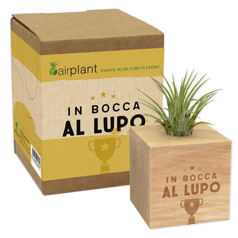 Un set airplant contiene una pianta vivente e un cubo di legno inciso al laser di alta qualità su cui è posizionata la pianta.