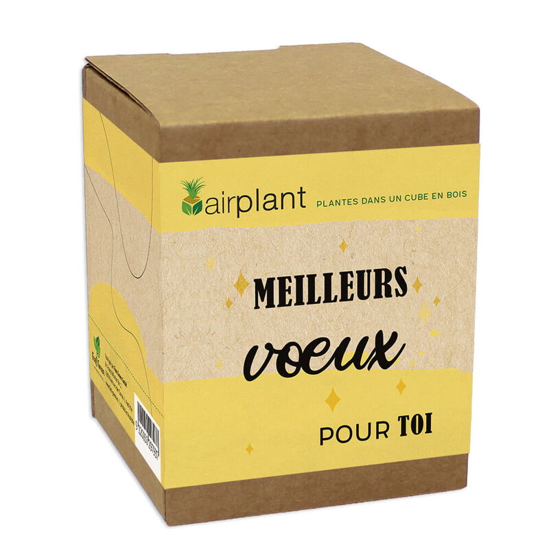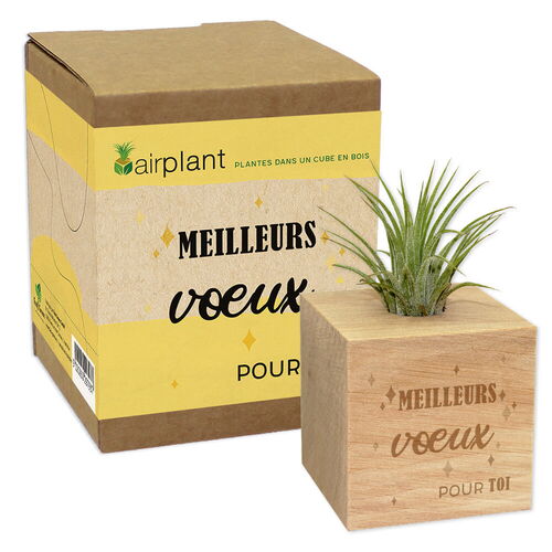 Un set airplant contient une plante vivante et un cube en bois de haute qualité pourvu d'une gravure au laser et sur lequel on place la plante.