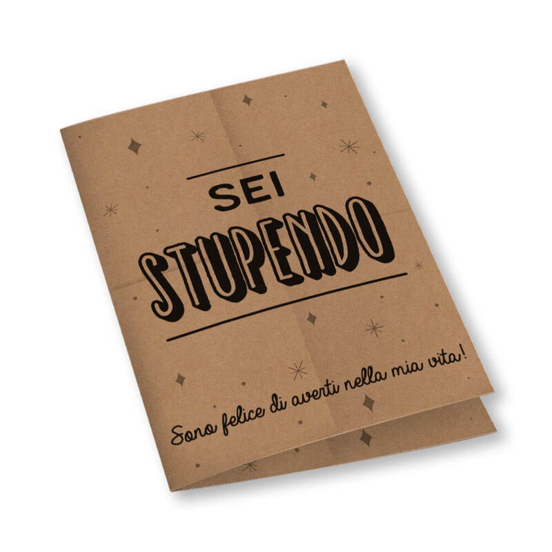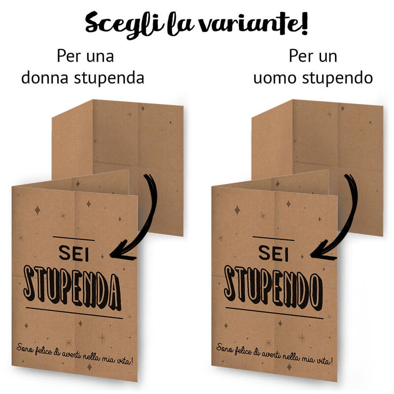 Sei stupendo/Sei stupenda! "Sono felice che tu sia nella mia vita" – è una frase che dovremmo imparare a dire più spesso. Con questo bigliettino, fai sapere alla persona che ami quanto è meravigliosa e speciale. All'interno, c'è abbastanza spazio per un messaggio personalizzato. Scegli regali unici, destinati a crescere nel tempo. Scegli la variante: sei stupendo o sei stupenda?