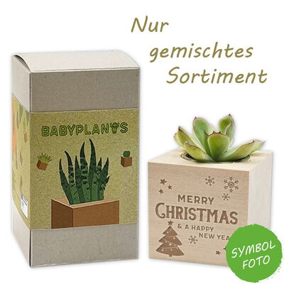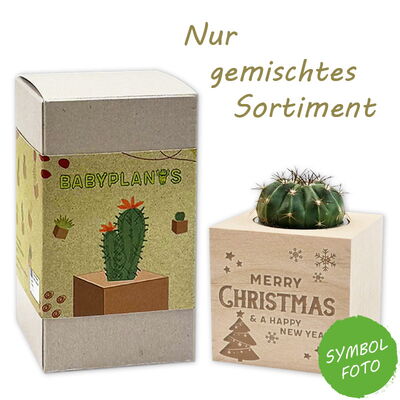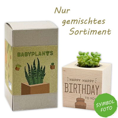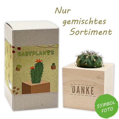 Kakteen und Sukkulenten sind durch ihre ausergeöhlichen Wuchsformen ein absulter Blickfang und noch dazu in der Pfelge sehr anspruchslos. Sie speichern Wasser in ihren fleischigen Stämmen und sind meist durch Dornen statt Blätter geschützt. Ihre oft bizarren Formen machen sie zu beliebten Zimmerpflanzen. Unsere Babyplants im nachhaltigen und dekorativen Holztopf sind daher ein tolles, grünes Geschenk für die verschiedensten Anlässe! Unsere Varianten mit den individuell gelaserten Sprüchen sind eine super trendige und nachhaltige Idee, um Glückwünsche mal auf die "wachsende" Art zu überbringen.