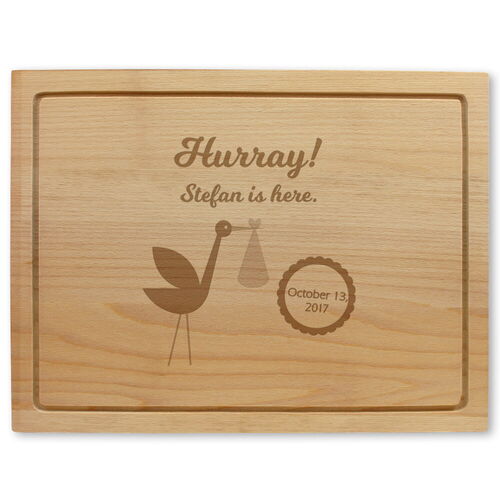 Hurray! The stork has landed and brought us a sweet baby! Surprise the new fledged parents for the birth of their child with a personally engraved wooden cutting board. This unique memento is not only useful as a practical kitchen utensil to prepare and serve delicious food, it also makes for a great decoration item.
