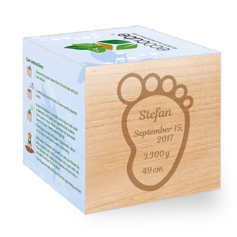 Surprise the new fledged parents for the birth of their child with a growing and personally engraved wooden cube. The growing plant turns into a unique decorative item and a long living memento for every room.