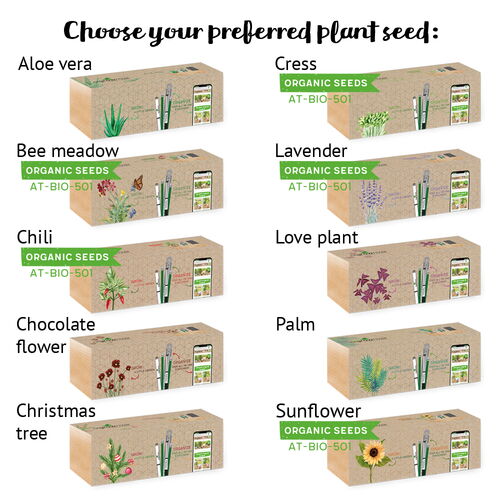 choose between the following plant seeds: aloe Vera, bee & butterlfy meadow , chili , chocolate flower, Chrismas tree, cress , lavender , love plant, palm, sunflower