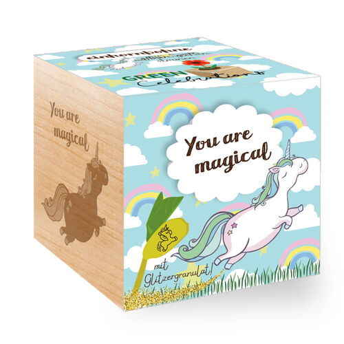 Merkmale: Der Würfel enthält eine sogenannte Jackbean oder Riesenbohne aus der sich ein "kleines Einhorn" entfaltet.