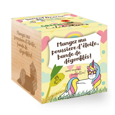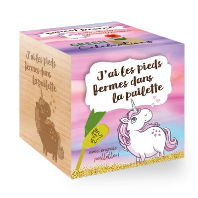 Notre édition spéciale « Cultive ta propre licorne » étonnera beaucoup les personnes qui la recevront et garantira un sourire aux lèvres. Quelques jours après avoir arrosé le cube, un haricot apparaîtra et son cotylédon présentera une licorne gravée sur les deux faces. C'est de la magie pure – unicorns are real!