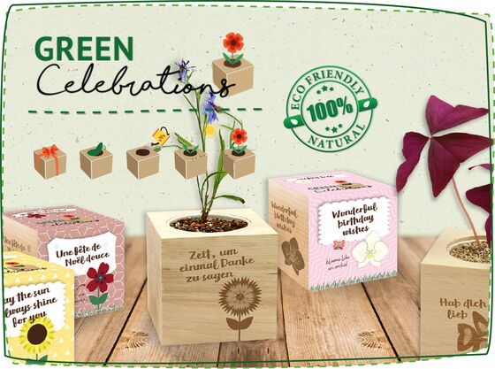 Toute personne cherchant un cadeau tout à fait personnel et original le trouvera parmi les Green Celebrations. Il existe un cube avec une plante et une gravure de qualité pour chaque occasion – que ce soit pour un anniversaire, pour souhaiter bonne chance ou simplement dire merci. Avec Green Celebrations on trouve toujours le cadeau correspondant – la carte de vœux fait partie du passé.