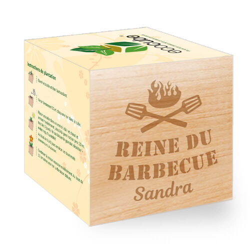 Longue vie à la reine des grillades! Récompense-la lors du prochain barbecue avec un cube en bois personnalisé avec un ecocube et nomme sa Majesté Reine du barbecue en service! L'ecocube a tout pour plaire: qu'il s'agisse de plantes aromatiques pour aromatiser les collations de sa Majesté, de fleurs décoratives ou de plantes décoratives impressionnantes pour la cuisine royale – un set de culture digne pour chaque goût souverain!