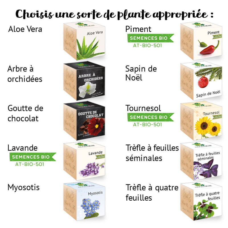 Choisis parmi les semences de plantes suivantes: Aloe Vera, arbre à orchidées, goutte de chocolat, lavande