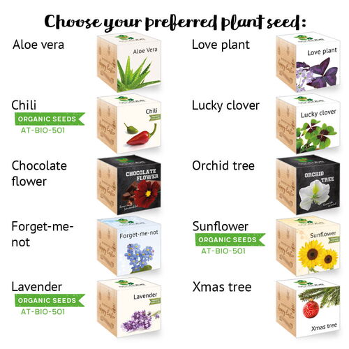 choose between the following plant seeds: aloe vera, chili , chocolate flower, forget-me-not, lavender , love plant, lucky clover, orchid tree, sunflower , Xmas tree