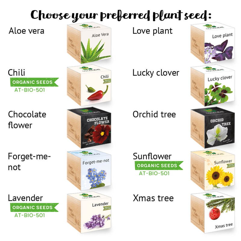 choose between the following plant seeds: aloe vera, chili , chocolate flower, forget-me-not, lavender , love plant, lucky clover, orchid tree, sunflower , Xmas tree