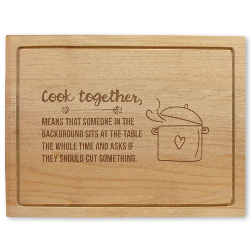 Cook together, means that someone in the background sits at the table the whole time and asks if they should cut something.