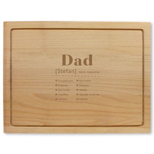How to define a dad? A dad is an everyday superhero with experience in inventing, mechanical matters, chauffeur, and as mentor. In addition, he is a protector around the clock, best buddy, and always has a shoulder to lean on. His strength is story telling. Dad is a jokester! Personalize the laser engraving with the first name of your dad. While prepping and serving delicious treats one will always be reminded of how wonderful he is!