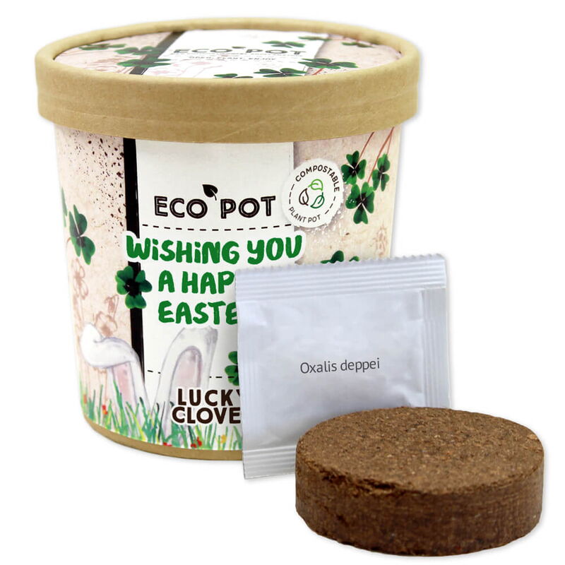 • As soon as the lucky clover gets too big for the ecopot, remove the paper sleeve around the plant pot and transplant the entire ecopot in a regular flower pot with soil.