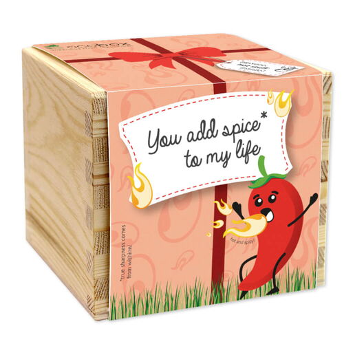 • As soon as the plant you have grown is too big for the ecobox, the chili plant can be transferred into a flower pot with some soil or outdoors using the compostable planting cup. The wooden box can then be used as a pen holder or gift box, for example!