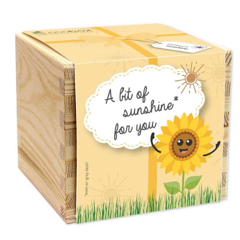 • As soon as the flower you have grown is too big for the ecobox, the sunflower can be transferred into a flower pot with some soil or outdoors using the compostable planting cup. The wooden box can then be used as a pen holder or gift box, for example!