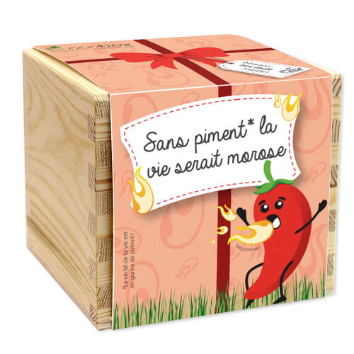 • Dès que la plante cultivée soi-même est trop grandes pour l'ecobox, il est possible de rempoter la plante de piment ainsi que le gobelet de culture biodégradable dans un pot de fleurs avec un peu de terre ou en plein air. La boîte en bois peut être ensuite utilisée comme porte-crayons par exemple ou comme boîte à cadeau !