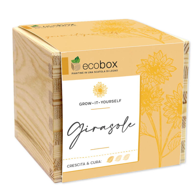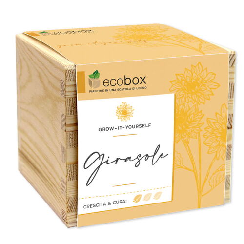 L'ecobox contiene compressa in fibra di cocco, targhetta in legno su cui scrivere, vasetto compostabile e sacchetto con semi di piante.