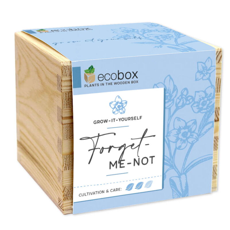 • As soon as the flower you have grown is too big for the ecobox, the forget-me-not can be transferred into a flower pot with some soil or outdoors using the compostable planting cup. The wooden box can then be used as a pen holder or gift box, for example!