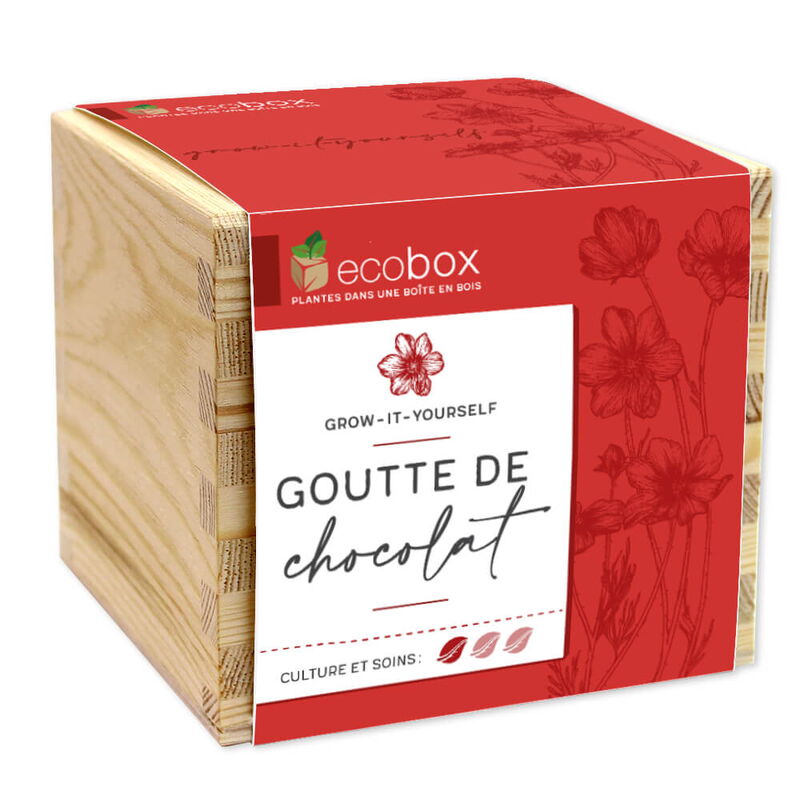 • Dès que les plantes cultivées soi-même sont trop grandes pour l'ecobox, il est possible de rempoter les gouttes de chocolat ainsi que le gobelet de culture biodégradable dans un pot de fleurs avec un peu de terre ou en plein air. La boîte en bois peut être ensuite utilisée comme porte-crayons par exemple ou bien comme boîte à cadeau !