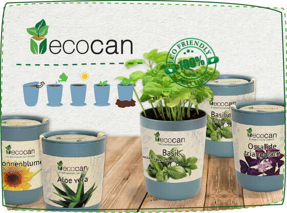 Grâce aux ecocans, le jardinage sur le rebord de la fenêtre est une véritable aventure pour tous même pour ceux qui n'ont pas la main verte. Les petits pots de plantes réalisés en fibres pressées de bambous et d'écorces de riz sont remplis d'après notre concept « Ready to grow ». Les semences sont déjà mélangées avec les granulés de croissance. Fini les mains pleines de terre! Ouvrir la boîte, arroser et au bout de quelques jours apparaissent les premières petites plantes de ecocan. Grâce au vaste sortiment des ecocans, il est garanti que chaque amateur de plantes trouvera la plante qui lui convient le mieux. Le jardinage durable fait vraiment plaisir!