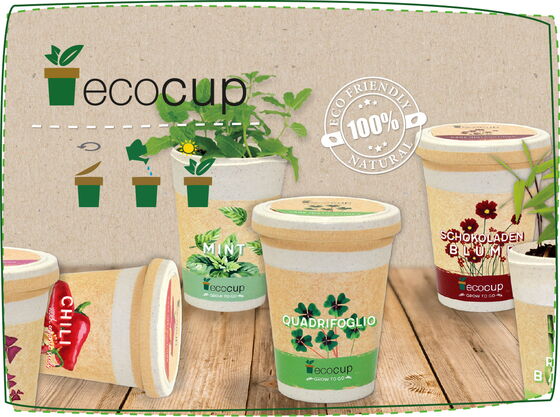 Coffee to go in its most natural form! Our ecocups are particularly eco-friendly mugs in a coffee cup style produced from pressed bamboo fibers and rice husks. Based on our "Ready to grow" concept, they are filled with a natural nutritional granulate mix with the seeds already mixed in.