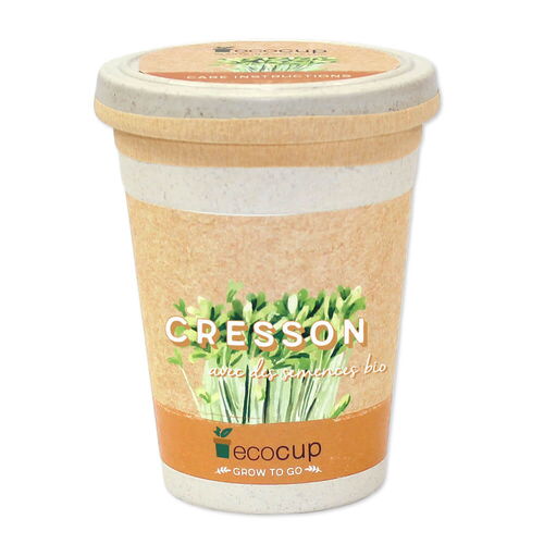 ecocup contient granulés de fibres de noix de coco, granulés d'argile et semences de plantes.