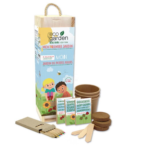 L'ecogarden contient une boîte en bois à colorier, des crayons de couleur, des pots de culture biodégradables, des pastilles de fibres de noix de coco, une spatule en bois pour écrire soi-même et des sachets de semences.