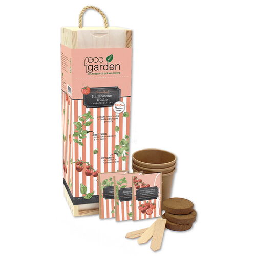 Das Anzuchtset enthält Kokosfasertabletten, biologisch abbaubare Pflanzbecher, Pflanzmarker und Samentüten mit biozertifizierter Pflanzensamen.