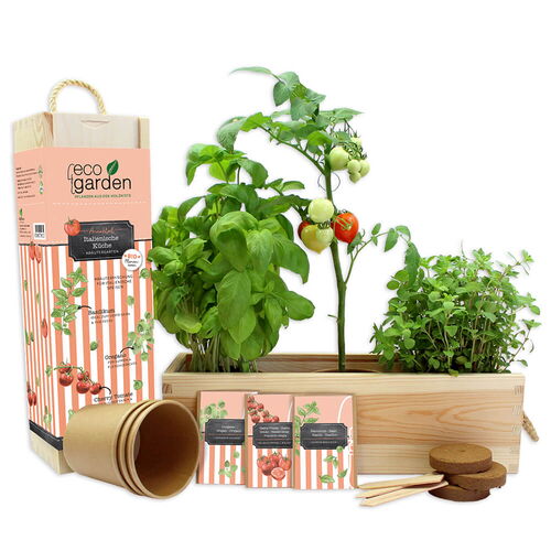 • Sobald der italienische Kräutergarten üppig gewachsen ist, können die ersten Blätter und die gereiften Cherry Tomaten fortlaufend geerntet und zum Verfeinern von italienischen Speisen verwendet werden.