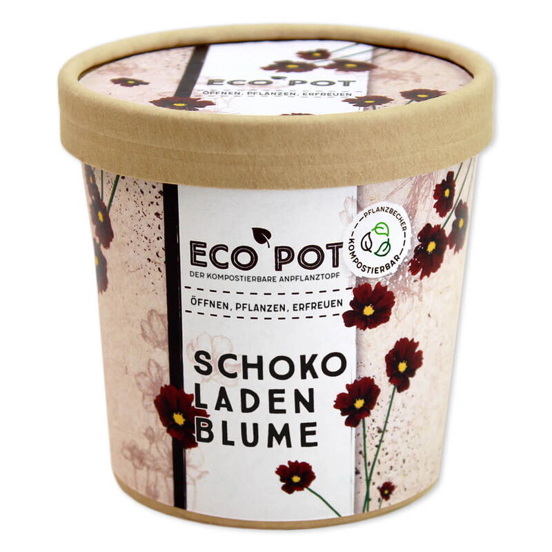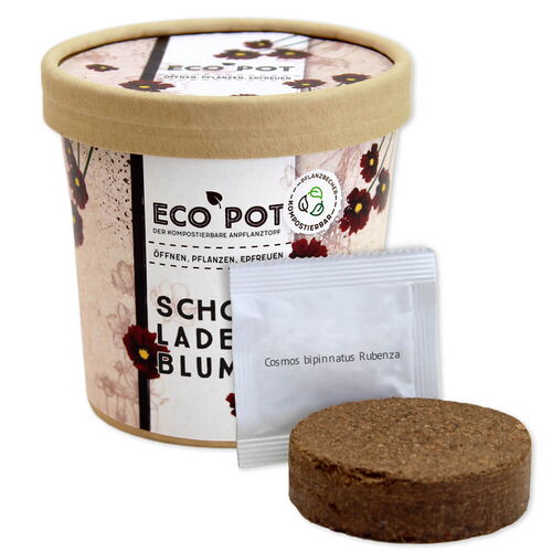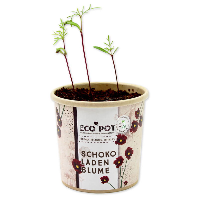 • Werden die Schokoladenblumen zu groß für den Pot, Banderole vom Becher entfernen und ecopot in einen Blumentopf mit etwas Erde oder ins Freie verpflanzen.
