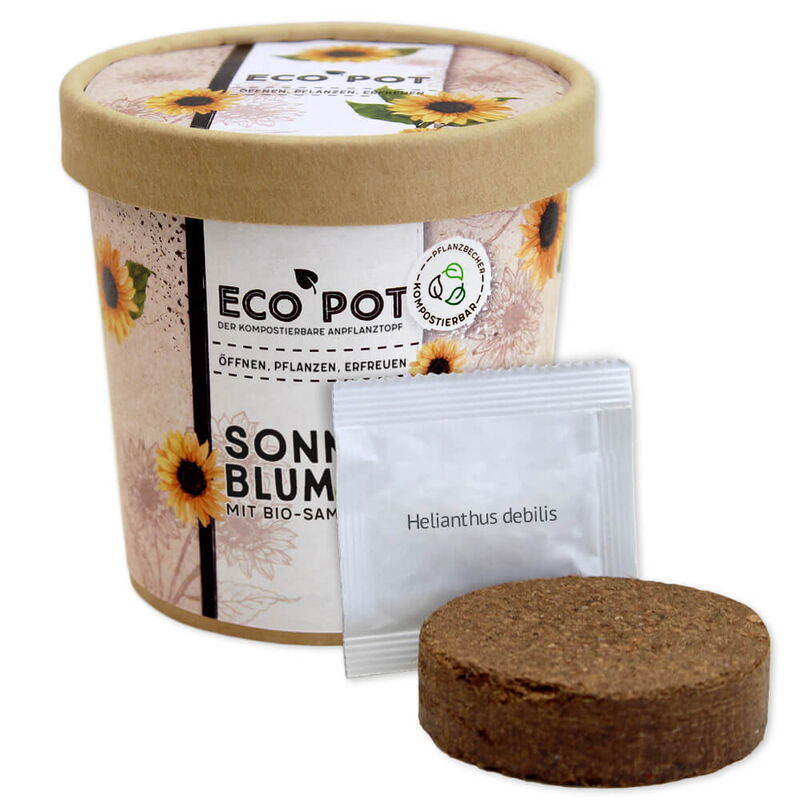 ecopot enthält einen kompostierbaren Anzuchtbecher, eine Kokosfasertablette und eine kleine Pflanzensamentüte.