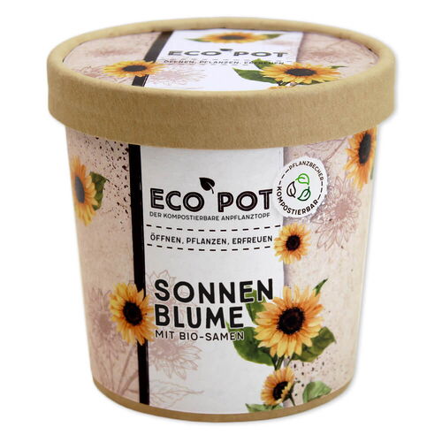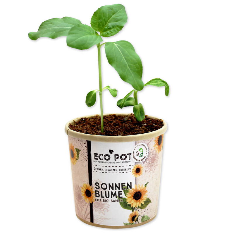• Werden die Sonnenblumen zu groß für den Pot, Banderole vom Becher entfernen und ecopot in einen Blumentopf mit etwas Erde oder ins Freie verpflanzen.