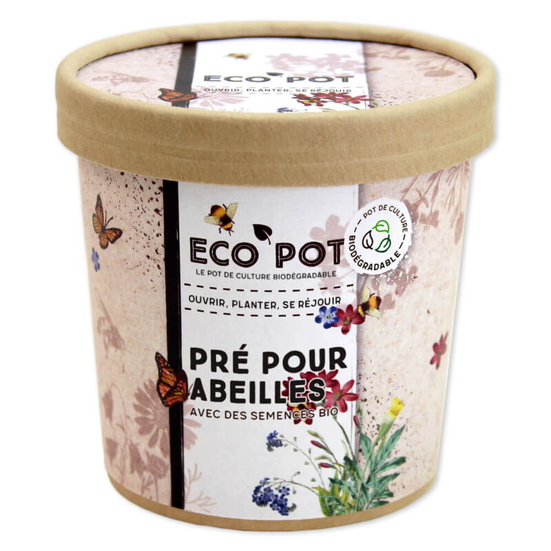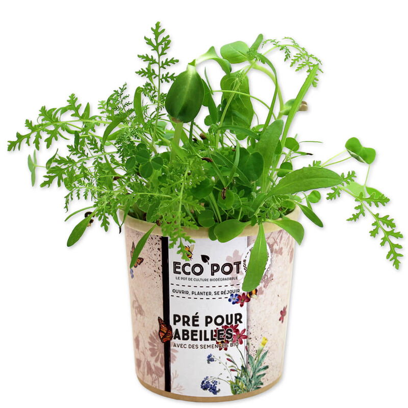 ecopot contient un pot biodégradable, des tablettes de fibres de coco et un sachet avec des semences de plantes.
