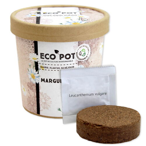 ecopot contient un pot biodégradable, des tablettes de fibres de coco et un sachet avec des semences de plantes.