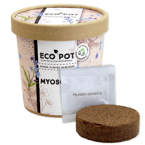 ecopot contient un pot biodégradable, des tablettes de fibres de coco et un sachet avec des semences de plantes.