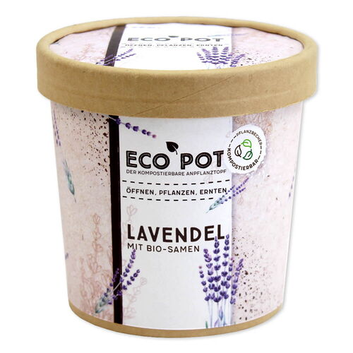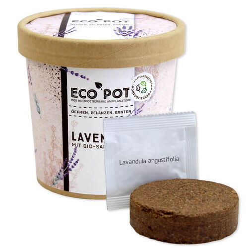 ecopot enthält einen kompostierbaren Anzuchtbecher, eine Kokosfasertablette und eine kleine Pflanzensamentüte.