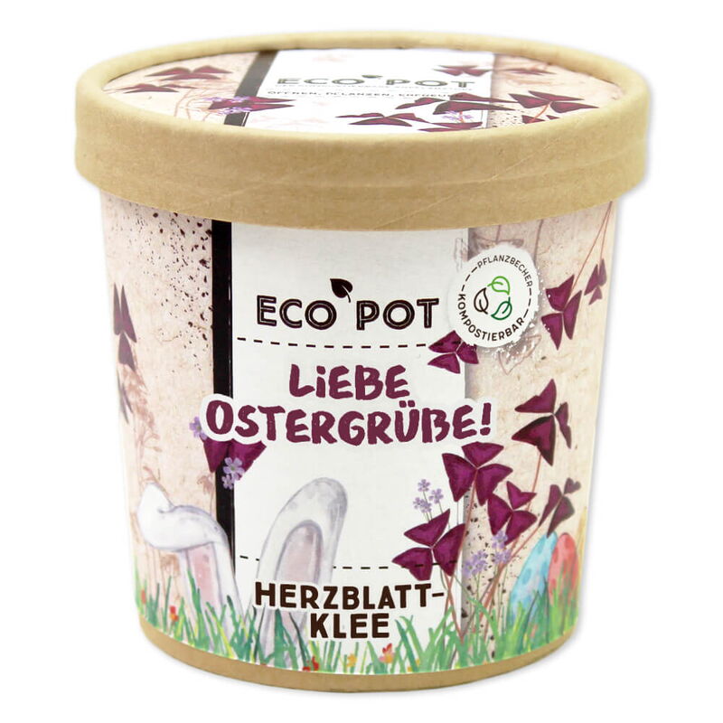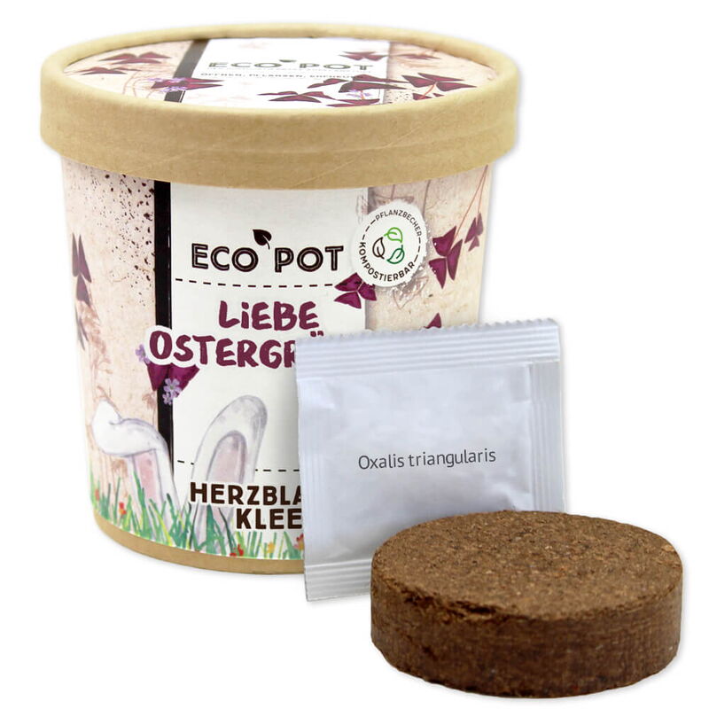 • Wird der Herzblattklee zu groß für den Pot, Banderole vom Becher entfernen und den kompostierbaren ecopot in einen Blumentopf mit etwas Erde verpflanzen.