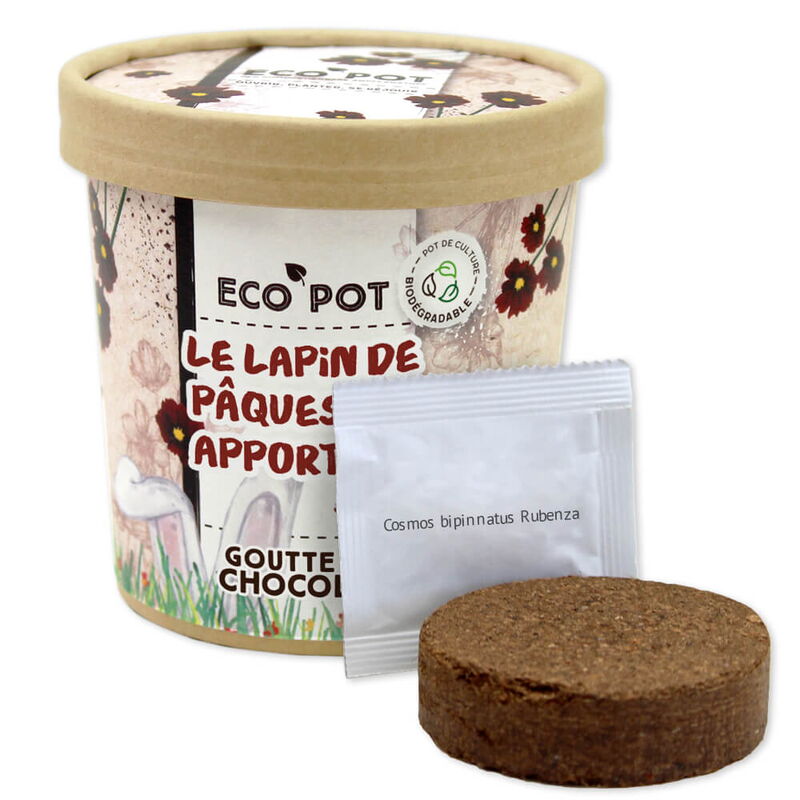 ecopot contient un pot biodégradable, des tablettes de fibres de coco et un sachet avec des semences de plantes.