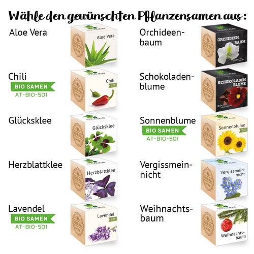 Wähle zwischen folgenden Pflanzensamen: Aloe Vera, Chili