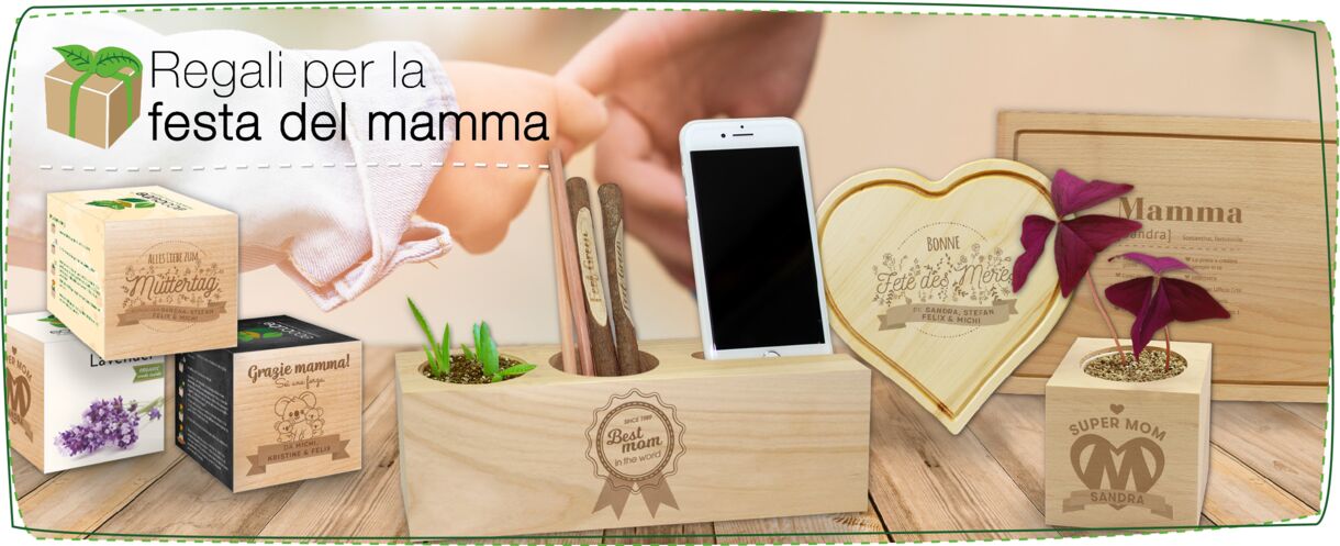 Nella sezione dedicata alla Festa della Mamma trovi tante idee regalo uniche e originali! Scegli tra ecocube, orgrownizer, taglieri classici o a forma di cuore… la tua mamma si merita solo il meglio! Ci occuperemo di ogni ordine fin nel minimo dettaglio, con tutta la cura e l'amore di cui siamo capaci.