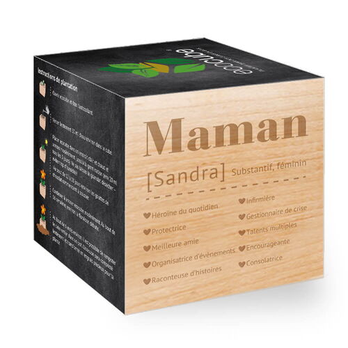 Comment définit-on une Maman? Une Maman est une super-héroïne dans la vie quotidienne avec des expériences dans la gestion des crises, dans l'organisation d'évènements, pour donner des soins et encourager. En plus elle joue aussi un rôle de protectrice vingt-quatre heures sur vingt-quatre, elle est la meilleure amie et elle sait consoler. Elle est parfaite pour raconter des histoires. Maman a des talents multiples! En un tour de main personnalise la gravure au laser en inscrivant le prénom de ta Maman. Finalement tu choisis aussi les semences pour tes cubes de plantes personnels et ainsi ton cadeau personnel naturel est prêt.