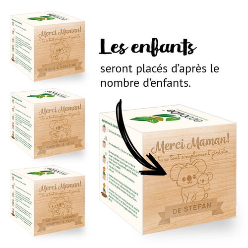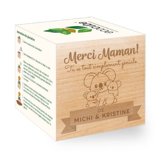 Parfaite. Plus que parfaite. Maman géniale. Personnalise l'ecocube pour ta Maman adorée en inscrivant le nombre de ses enfants ainsi que leurs prénoms. Les enfants seront placés d'après le nombre d'enfants. Finalement tu choisis aussi les semences pour tes cubes de plantes personnels et ainsi ton cadeau personnel naturel est prêt.