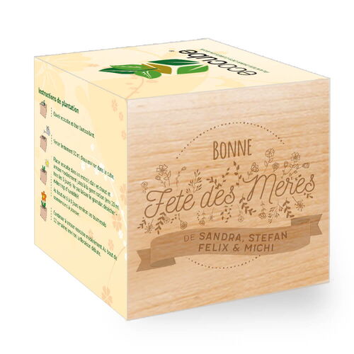 Bonne Fête des Mères! Offre un cadeau personnel naturel à ta Maman pour la Fête des Mères. Réalises-en un tour de main ta gravure au laser personnelle en inscrivant ton prénom (et les prénoms de tes frères et sœurs). Finalement tu choisis aussi les semences pour tes cubes de plantes personnels et ainsi ton cadeau personnel naturel est prêt. Quand la plante est trop grande pour le cube, on peut tout simplement la rempoter dans un pot de fleurs avec un peu de terre tout en y laissant le gobelet biodégradable et le cube peut servir de porte-crayons par exemple.
