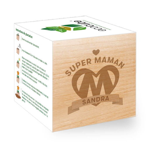 Une super-héroïne sans cape c'est une Maman. Aucune super-héroïne n'est comparable à la super Maman! Réalises-en un tour de main ta gravure au laser personnelle en inscrivant le prénom de ton héroïne. Finalement tu choisis aussi les semences pour tes cubes de plantes personnels et ainsi ton cadeau personnel naturel est prêt. Quand la plante est trop grande pour le cube, on peut tout simplement la rempoter dans un pot de fleurs avec un peu de terre tout en y laissant le gobelet biodégradable et le cube peut servir de porte-crayons par exemple.
