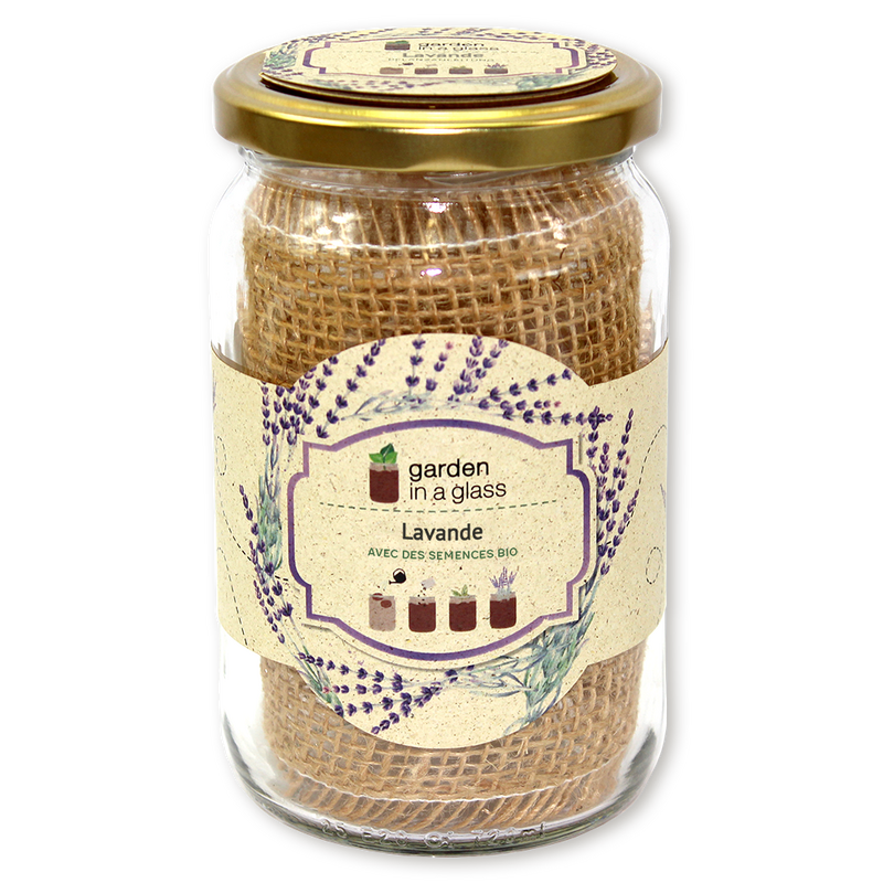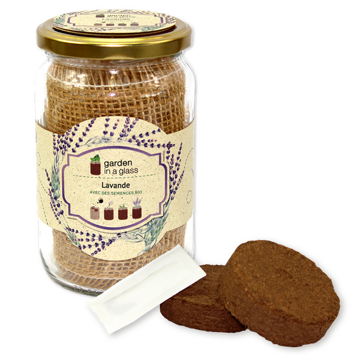 Le garden in a glass contient des pastilles de fibres de noix de coco, un sac en jute, un sachet de semences de plantes avec des semences de plantes certifiées bio.