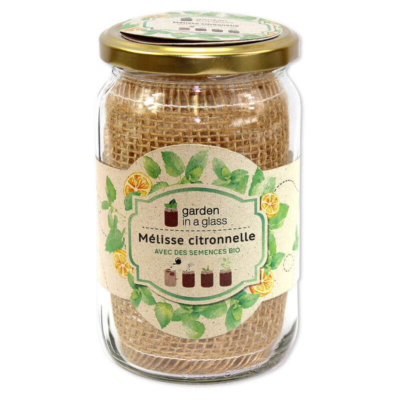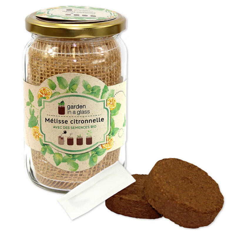 Le garden in a glass contient des pastilles de fibres de noix de coco, un sac en jute, un sachet de semences de plantes avec des semences de plantes certifiées bio.