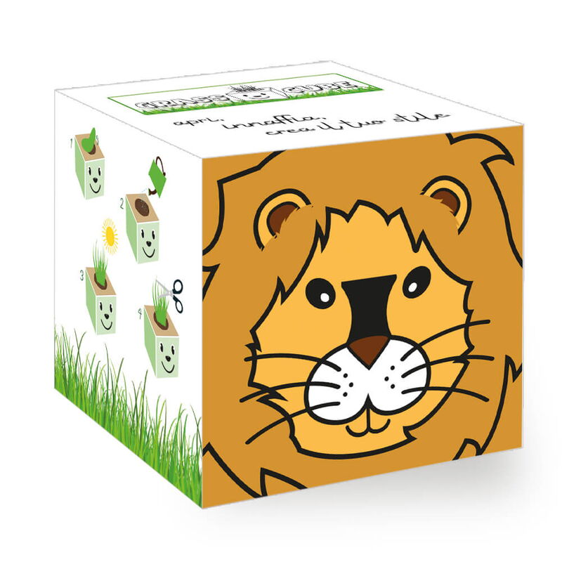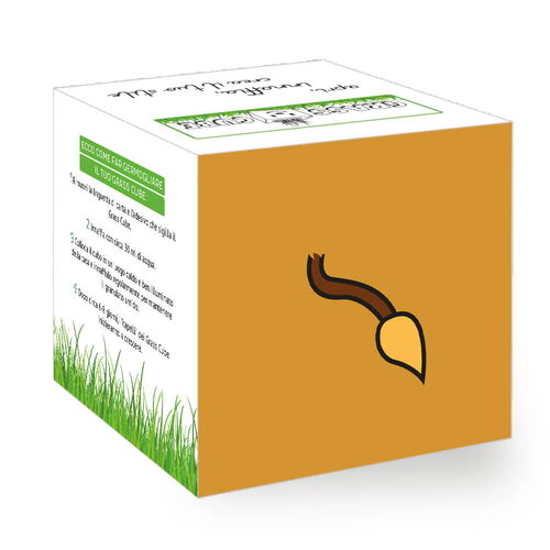 Grass Cube contiene granulato di fibra di cocco, granulato di argilla, vasetto compostabile e i semi.