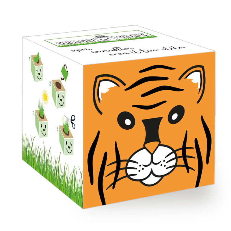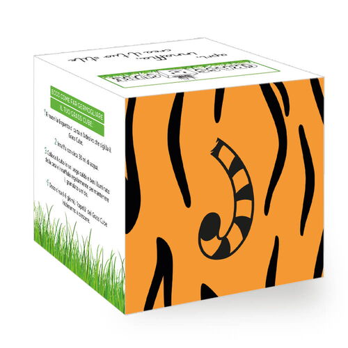 Grass Cube contiene granulato di fibra di cocco, granulato di argilla, vasetto compostabile e i semi.