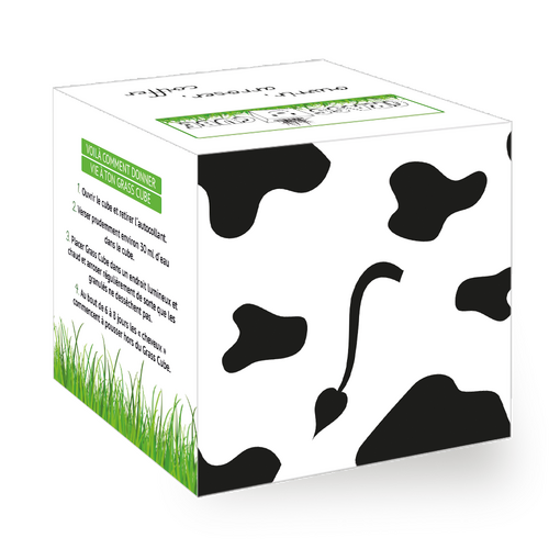 Grass Cube contient des granulés de fibres de noix de coco, des granulés d'argile, un gobelet de culture biodégradable et des semences de plantes